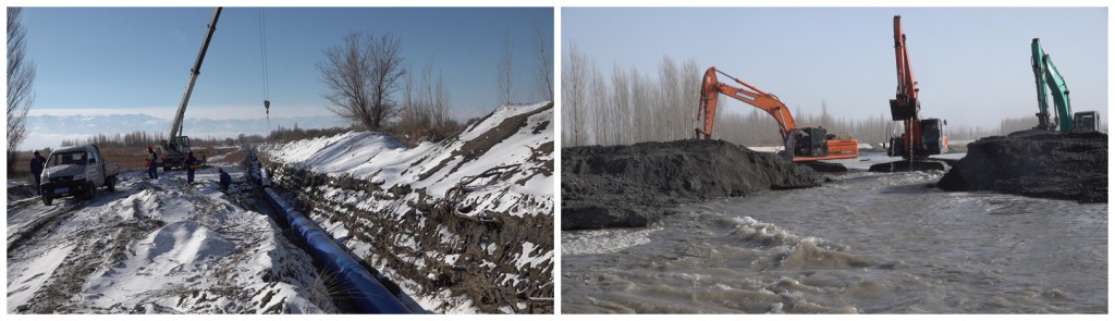 由于施工工期短,為了按時完成管道穿引洪渠任務,目前,在項目執行經理柴琳、項目副經理張寶深以及項目技術負責人蔡京利的帶領下,項目部正在堅持24小時不間斷施工;除此之外,由于施工現場“戰線長”,距離附近集鎮和項目部基地都較遠,項目部在河渠邊搭建兩個軍用帳篷做為施工指揮部,“冷饃硬馕加泡面”成了項目部午餐“標配”。施工間歇,施工人員就在管溝邊用撿到的枯木點燃火堆取暖。在穿越四棵樹河施工段施工過程中,管溝挖深總共約4米,但管溝中的水深卻高達3米,由于管道安裝滿足標高要求,即使面臨開挖出水多,施工難度大的困境,項目副經理馬讓同志依舊毫不猶豫地召集起項目上的黨員同志,帶頭穿上雨衣皮褲,站在挖機斗中下河扶塔尺測標高,保證管道安裝質量。他們的身影深深地感染著項目上的每一個人。在四棵樹河中管道施工時,需要將上游河水截流,時間緊任務重,項目全體員工不喊累不叫苦,沒日沒夜加班奮戰,搶抓施工進度......