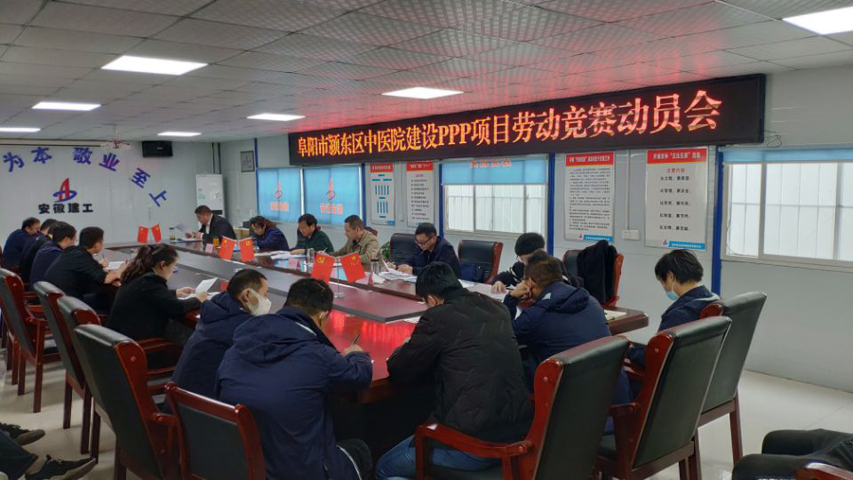 4月8日下午,阜陽市潁東區中醫院建設PPP項目部召開2020年勞動競賽動員會。公司黨委書記、董事長胡六中,副總經理高飛,紀委書記、工會主席李寬旭及公司相關部門人員、房建(裝飾)分公司班子成員及項目部員工參會,會議由分公司黨支部副書記張曼主持。