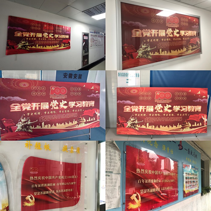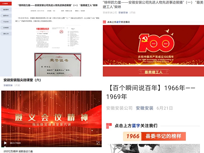 公司黨委第一時間編印專刊宣傳板報下發(fā)至所屬各單位和基層項目一線,用好企業(yè)網站、微信公眾號、電子屏、宣傳欄和所屬各單位、各項目部所有宣傳陣地,在公司網站、微信公眾號先后開設“百個瞬間說百年”“黨史學習教育專欄系列報道”“榜樣的力量——安徽安裝公司先進人物先進事跡展播”“記錄奮進力量—安徽安裝公司基層一線事跡展播”等專欄進行專題宣傳,大力營造“學習黨史有熱情,干事創(chuàng)業(yè)有激情”的良好氛圍,合肥分公司黨支部舉辦黨史學習教育主題攝影大賽,努力營造悟初心、守初心、踐初心的強大聲勢。
