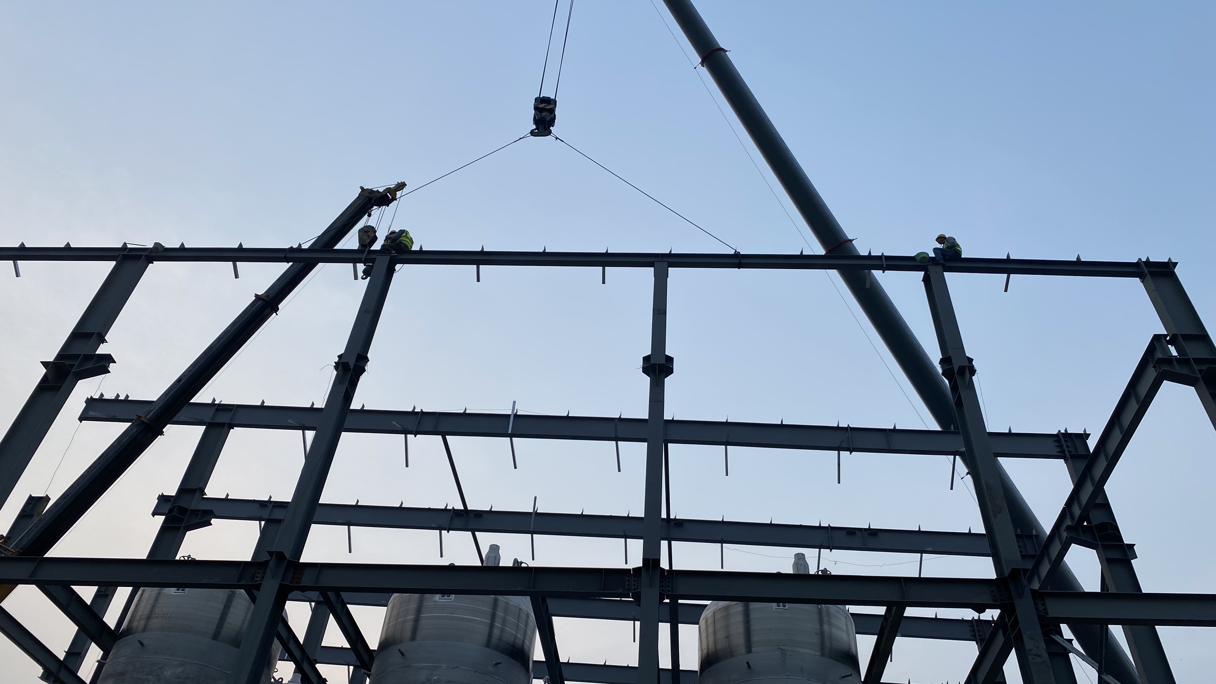 發(fā)酵車間吊車大臂高展,C區(qū)鋼結(jié)構(gòu)工程鋼梁安裝正在進行,司索工鋼梁綁扎穩(wěn)固后,現(xiàn)場信號工發(fā)出清晰信號,經(jīng)驗豐富的司機操控著吊車將鋼梁緩緩升起,20米的高空上,兩名安全防護的工人等待著鋼梁靠近,停穩(wěn)、就位、穩(wěn)固、矯正、固定...一道道鋼梁就這樣架起,發(fā)酵車間的金屬骨架就這樣拔地而起,逐步形成。