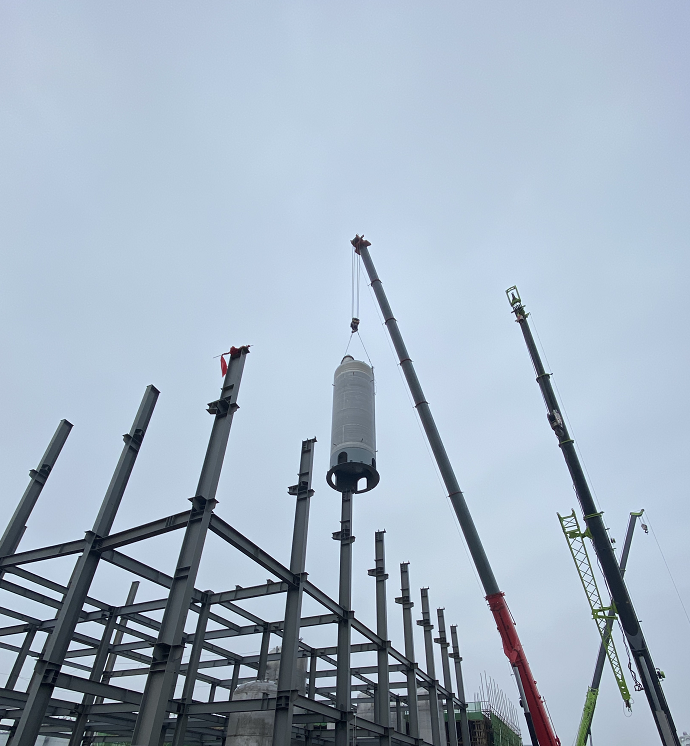 十余噸的罐體在吊車的牽引下緩緩升起,小心翼翼,精準前往指定基礎(chǔ),施工人員進行固定矯正...30多臺工業(yè)用罐就這樣矗立起來。