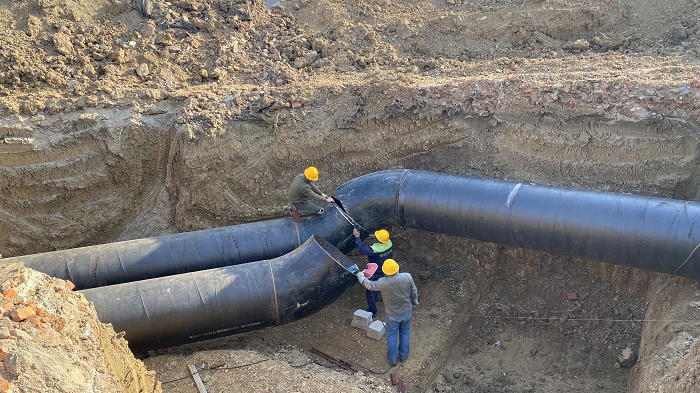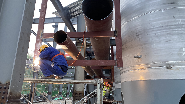 工藝管道班組也在忙忙碌碌,壓縮空氣管道在不斷架設(shè),料場加工好的管道在吊車、葫蘆的牽引下就位,專業(yè)的焊工進行焊接,慢工出細活,保證每一道焊口符合規(guī)范要求,室外的循環(huán)水管也在與老廠的接口緊張對接。