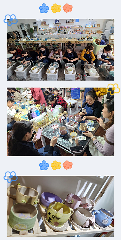 活動開始,大家一起參觀了各種各樣、富有特色的陶藝作品,使大家對“陶藝”產生了濃厚的興趣。首先陶藝老師為大家講解了制作過程以及注意事項,并演示了捏壓、拉胚、修胚、上色等制作陶藝的步驟。在老師的精心指導下,大家先從一塊無固定形狀的土坯泥塊開始,進行練泥、拉坯,只見放置在轉盤中心的泥團,隨手法的屈伸收放,不同形狀的杯子在大家的手中被創造出來。隨后大家用專用顏料在陶體上畫上自己心儀的圖案和彩繪,不一會兒,陶泥像被賦予了新的生命一般,一朵朵花,一只只小動物都躍然于陶藝素胚杯上,原本樸素的陶藝作品頓時活靈活現。最終一件件獨具匠心的陶藝作品,展現在大家面前,大家都十分期待早日拿到經過上釉和燒制后親手制作的作品。