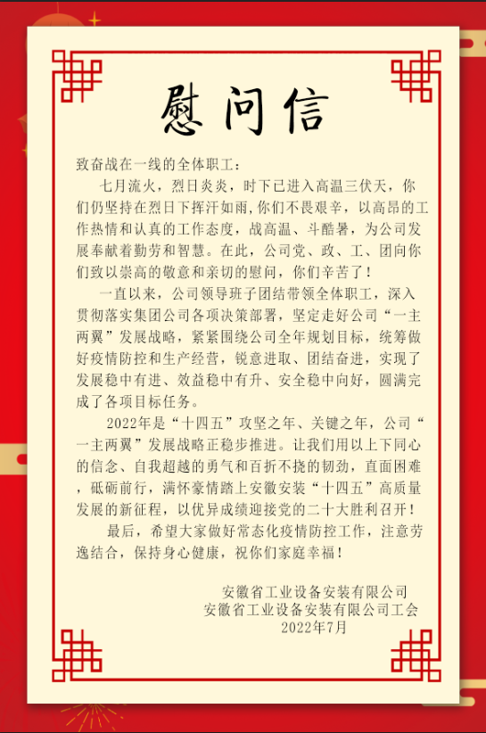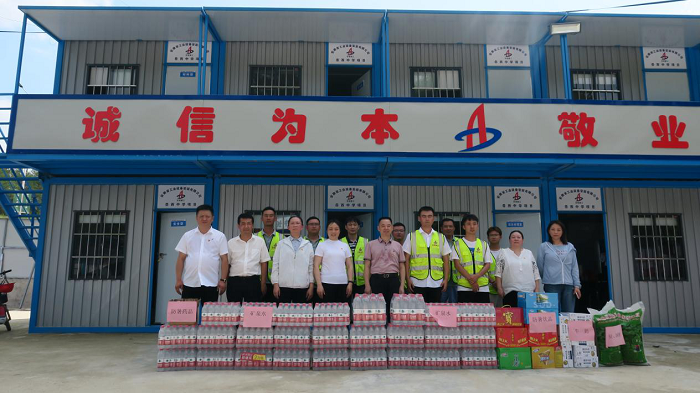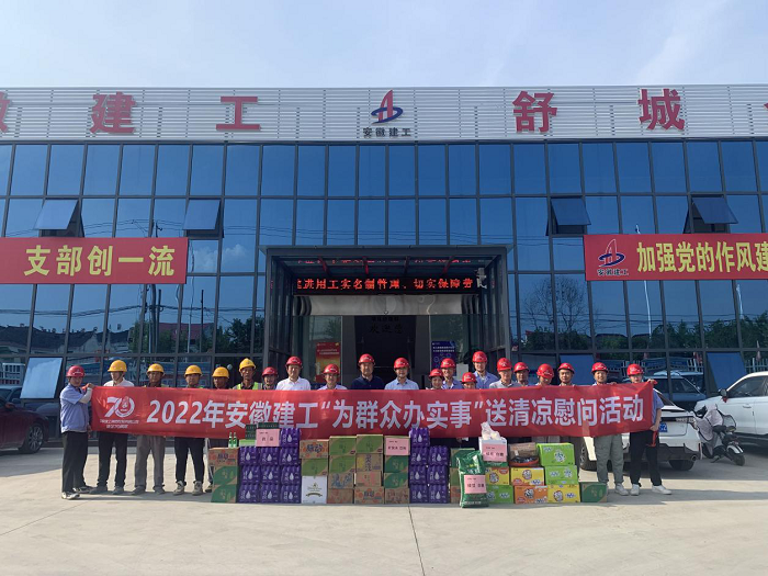 公司工會先后來到岳西中學(xué)建設(shè)項目(一期)安裝工程項目、中石化安慶分公司煉油轉(zhuǎn)化工200噸/小時污水汽提裝置項目、舒城第一中學(xué)遷建項目、四水廠DN1800、DN1400供水管道遷建工程管網(wǎng)項目、花園大道(徽州大道-包河大道)道路工程項目、定遠壹石通化學(xué)科技廠房項目、凱盛科技超薄柔性玻璃(UTG)二期5#、6#車間及配套設(shè)施工程項目,給廣大一線職工送去白糖、綠豆、礦泉水、飲料、藥品等防暑降溫物品,將工會組織的關(guān)心關(guān)愛傳遞給項目職工。