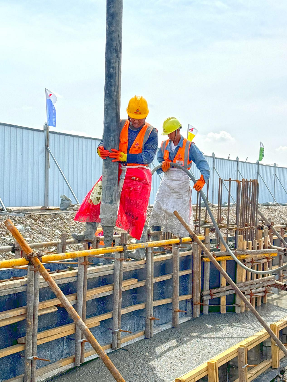 該項目施工現場人頭攢動,機械轟鳴,駐場技術人員頭頂烈日、靠前指揮,施工工人往來穿梭,或支設模板,或綁扎鋼筋,與夏競速,“激戰”正酣。項目工期緊任務重,為搶進度、嚴安全、保工期、抓質量,項目部嚴格制定施工進度計劃,統籌安排施工人、材、機,合理高效進場施工作業,目前項目正在進行變電所及廠房的基礎工程。