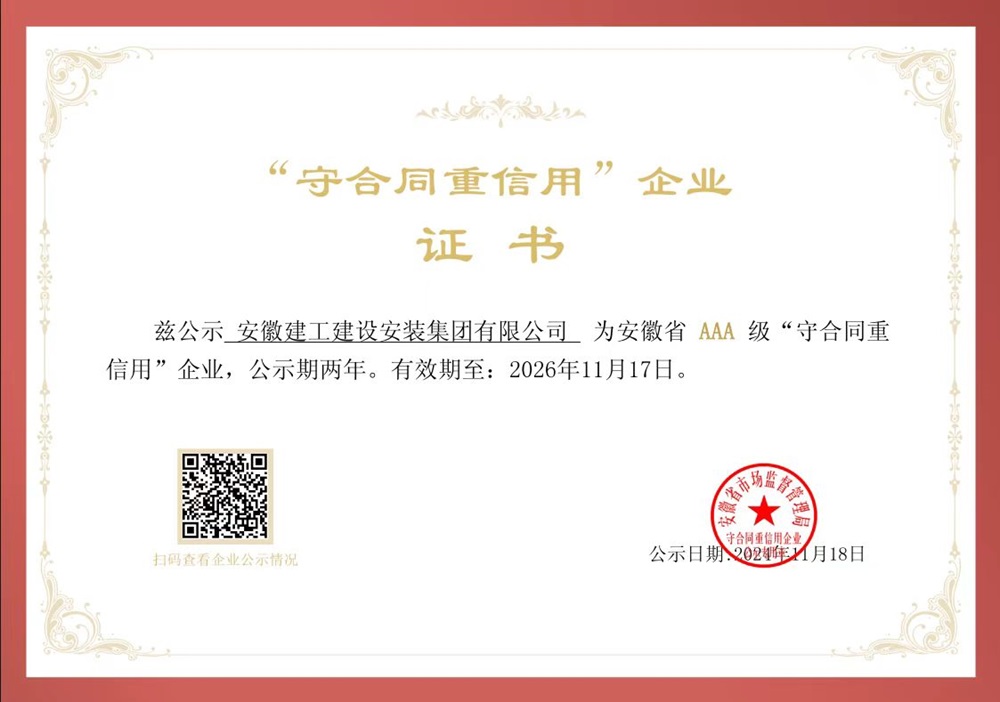 近日,安徽省市場監督管理局傳來喜訊,安徽建工建設安裝集團有限公司被評為安徽省AAA級“守合同重信用”企業。