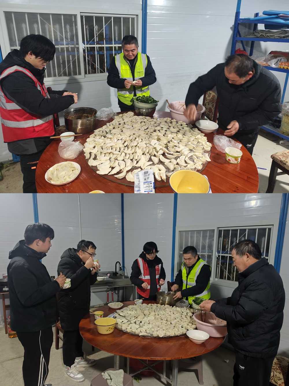 在新橋智能制造產業園一階段一標項目機電安裝工程項目部,一場同樣歡樂的包餃子活動也在如火如荼地進行著。項目部的員工們齊聚一堂,大家分工合作,有的負責調餡,確保餡料的口味恰到好處;有的負責擺放餃子,將包好的餃子整齊地排列在托盤上。雖然大家都很忙碌,但空氣中洋溢著歡聲笑語。大家一邊包餃子,一邊交流著項目上的工作進展和生活趣事,氛圍融洽和諧。