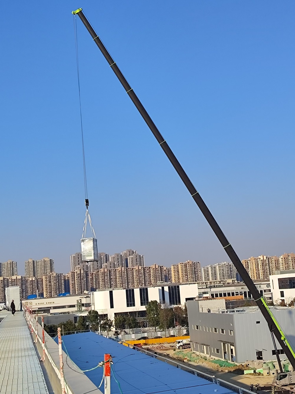 近日,車間一大型設備組合式空調陸續到貨,項目部有序開展組合式空調現場吊裝工作。為了確保吊裝工作的順利進行,項目部多次召開方案實施推進會,根據設備到場計劃,結合天氣情況、進場路線、現場站位、部件起吊等反復優化吊裝方案。梳理工作清單、制定工作任務、責任落實到人。同時采用現場拉設警戒區域、現場作業交底、試吊、全程看護作業等方式,保障現場吊裝作業安全進行。