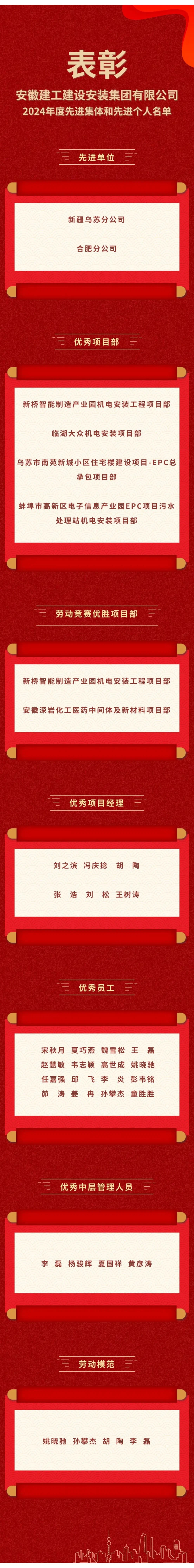 2月24日至26日,安徽建工建設(shè)安裝集團(tuán)有限公司十七屆五次職工大會暨2025年工作會議在滁州召開。會議期間,對2024年度先進(jìn)集體和個(gè)人進(jìn)行了表彰,激勵(lì)全體員工向先進(jìn)看齊、向榜樣學(xué)習(xí),為公司發(fā)展貢獻(xiàn)更大力量。公司領(lǐng)導(dǎo)班子出席會議并為受表彰集體、個(gè)人頒獎(jiǎng),部分受表彰先進(jìn)單位和個(gè)人代表結(jié)合工作實(shí)際作了交流發(fā)言。