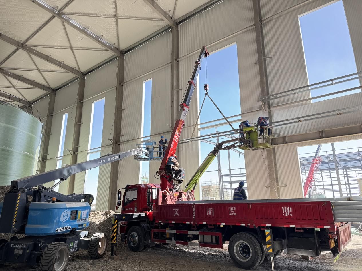 項目地處高海拔鹽湖區,缺氧且淡水匱乏,施工環境惡劣,資源保障困難。面對不利因素,項目團隊迎難而上,積極尋找解決方案,為項目順利推進筑牢基礎。截至目前,項目已取得顯著階段性成果,廠房主鋼構全部完成,管廊鋼結構完成約95%,防火涂料完成80%,屋面及墻面圍護結構完成約50%,配電房裝飾裝修工作有序進行,各項任務按計劃穩步推進。