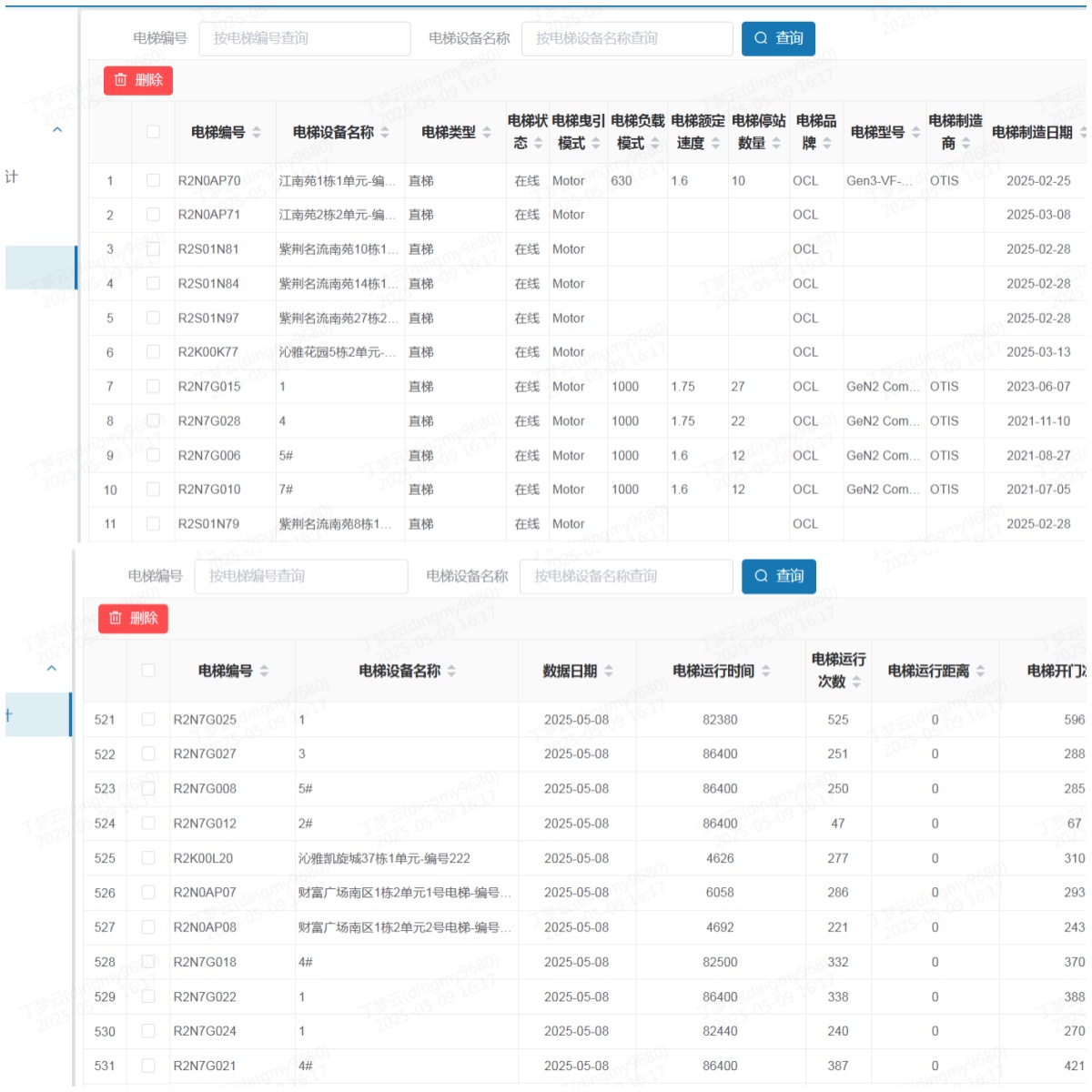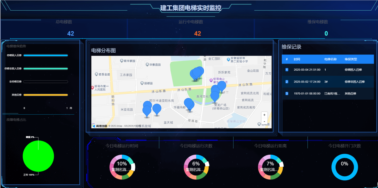新搭建的電梯管理模塊構(gòu)建起高效的數(shù)據(jù)互通橋梁,不僅能夠?qū)崟r獲取已上線電梯編號、電梯設備名稱等各項基礎(chǔ)數(shù)據(jù),還能精準監(jiān)測電梯運行時間、運行距離、運行次數(shù)、開門次數(shù)等動態(tài)數(shù)據(jù)信息。該系統(tǒng)可全程追蹤電梯召修記錄,詳細記錄召修維保上報時間、電梯維保人員到場時間,以及電梯故障處理過程、因故障困人后的解救時間等信息。這些數(shù)據(jù)的全面整合與實時呈現(xiàn),能夠全方位、立體化掌握每臺電梯的運行狀態(tài)及故障率,增強了電梯運行的安全性和可靠性,有效提升電梯維保效率。