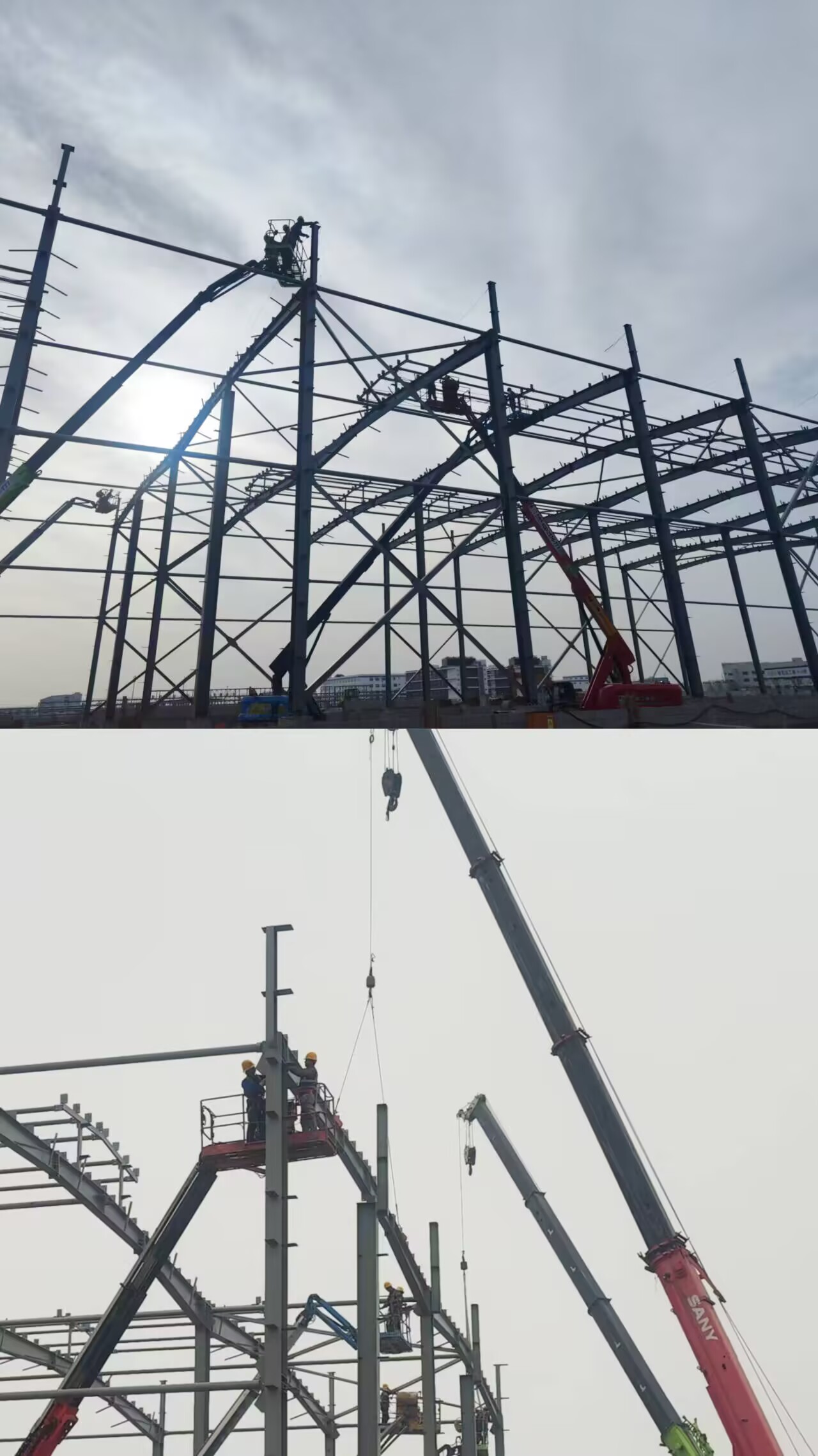 走進(jìn)項(xiàng)目施工現(xiàn)場(chǎng),起重機(jī)揮動(dòng)著粗壯的鋼鐵臂膀劃破天際,將一段段鋼梁精準(zhǔn)的吊裝至安裝位,曲臂車托舉著工人將鋼構(gòu)件嵌入到預(yù)定位置,保障高空作業(yè)人員的生命安全。這是力量與技術(shù)的二重奏,更是安全與效率的完美平衡,一幅現(xiàn)代工業(yè)建筑的壯美畫(huà)卷正徐徐展開(kāi)。